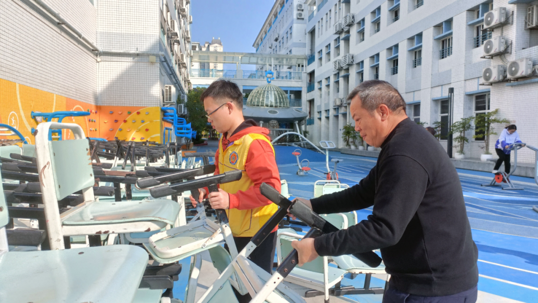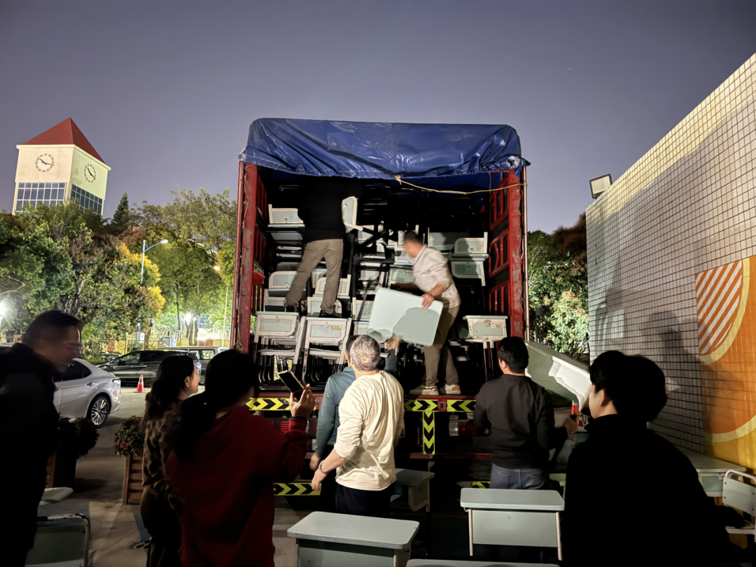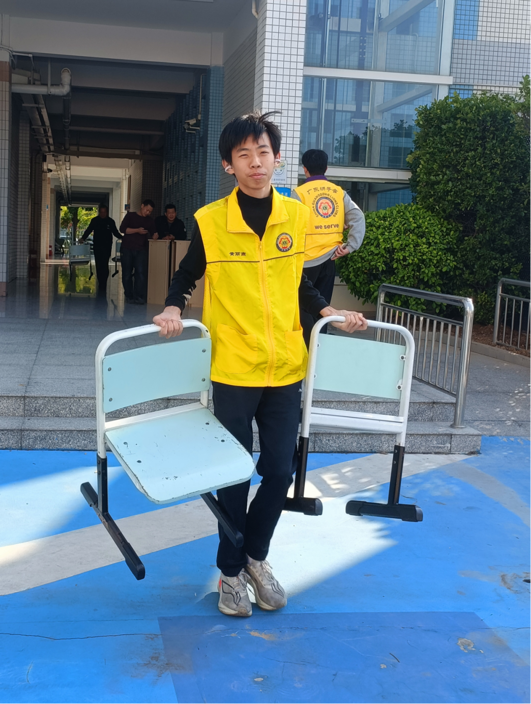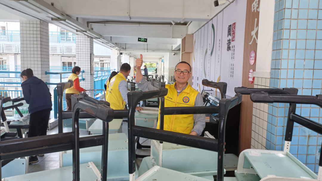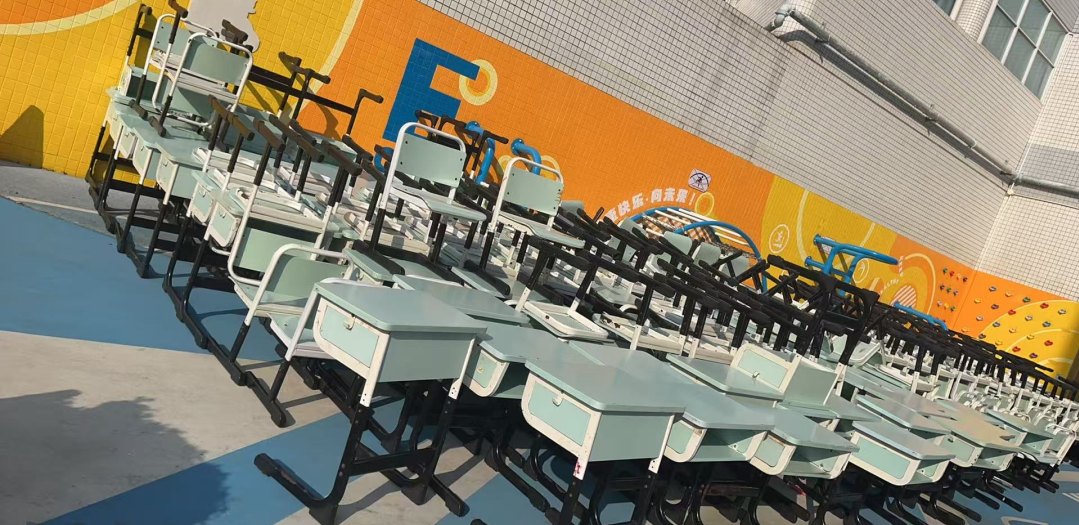 烈日当空,志愿者们化身“大力水手”,一人扛起两张桌椅,在教学楼里往返数十趟。从四楼到操场短短350米的路,他们的脚步却因反复上下楼梯而显得格外沉重。但没有人停下,因为每个人都清楚:每多扛一张桌子,就有更多孩子能挺直腰杆读书。