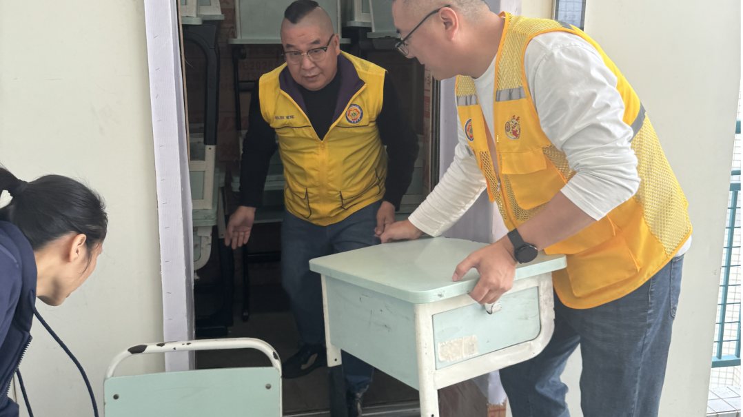 “一、二、起!”稚嫩的童声与沉稳的男声交织,9岁的小志愿者踮着脚,与父亲合力抬起一张课桌。他的额角渗出细密的汗珠,却咧着嘴笑:“这些桌子要给哥哥姐姐们写作业,不能摔着!”而在操场中,广东顺德容县同乡会秘书长陆超武正用双手稳稳托住桌角,汗水顺着脸颊往下滴落在水泥地上,瞬间洇出一片深色的痕迹。