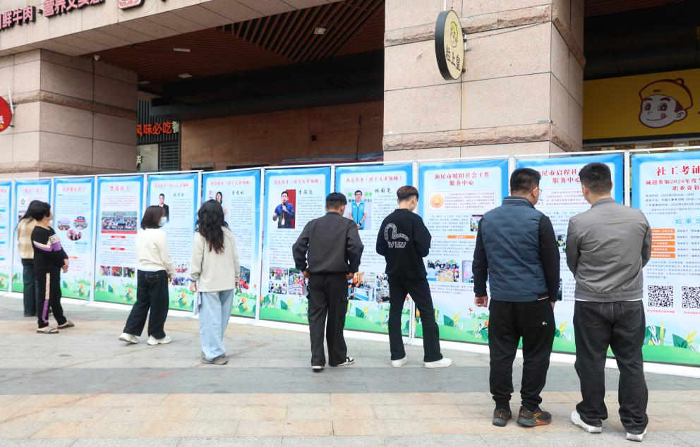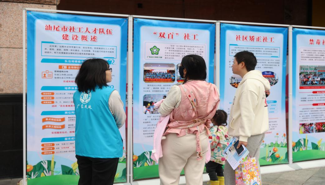 “原来汕尾有这么多优秀社工在默默奉献!”活动现场,11块精心打造的展板一字排开,构成一道亮眼的“社工风采长廊”,吸引着市民驻足观看、细细品读。从全市2143名持证社工的人才队伍概况,到“双百”社工87.8万人次入户走访的民生足迹;从禁毒社工13788人次关爱帮扶的坚守,到社区矫正社工的专业矫治成效,每一组数据都凝聚着社工群体的责任与担当,每一个案例都彰显着“助人自助”的专业精神。
